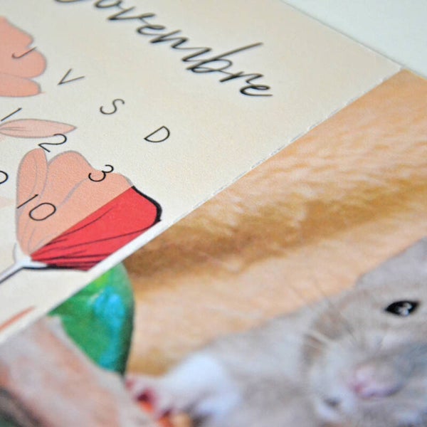 Le calendrier est imprimé sur 6 feuilles de papier de belle qualité de 230g/m² au format 14x20cm, recto verso. Chaque feuille présente un mois de l'année avec la photo de ton animal d'un côté et les jours du mois entourés d'illustrations de coquelicots de l'autre. Le design innovant inclut une prédécoupe, permettant de détacher facilement la section du mois de celle de la photo, afin de conserver et chérir les images de tes animaux même après la fin du mois.
