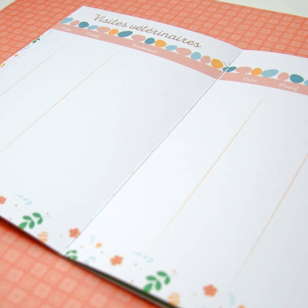 - Visites vétérinaires : 4 doubles pages pour consigner les visites, traitements, et recommandations du vétérinaire.
