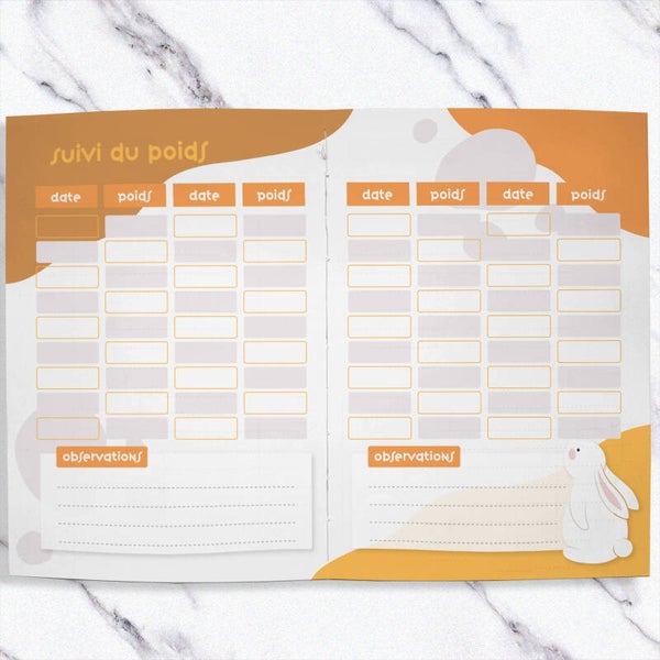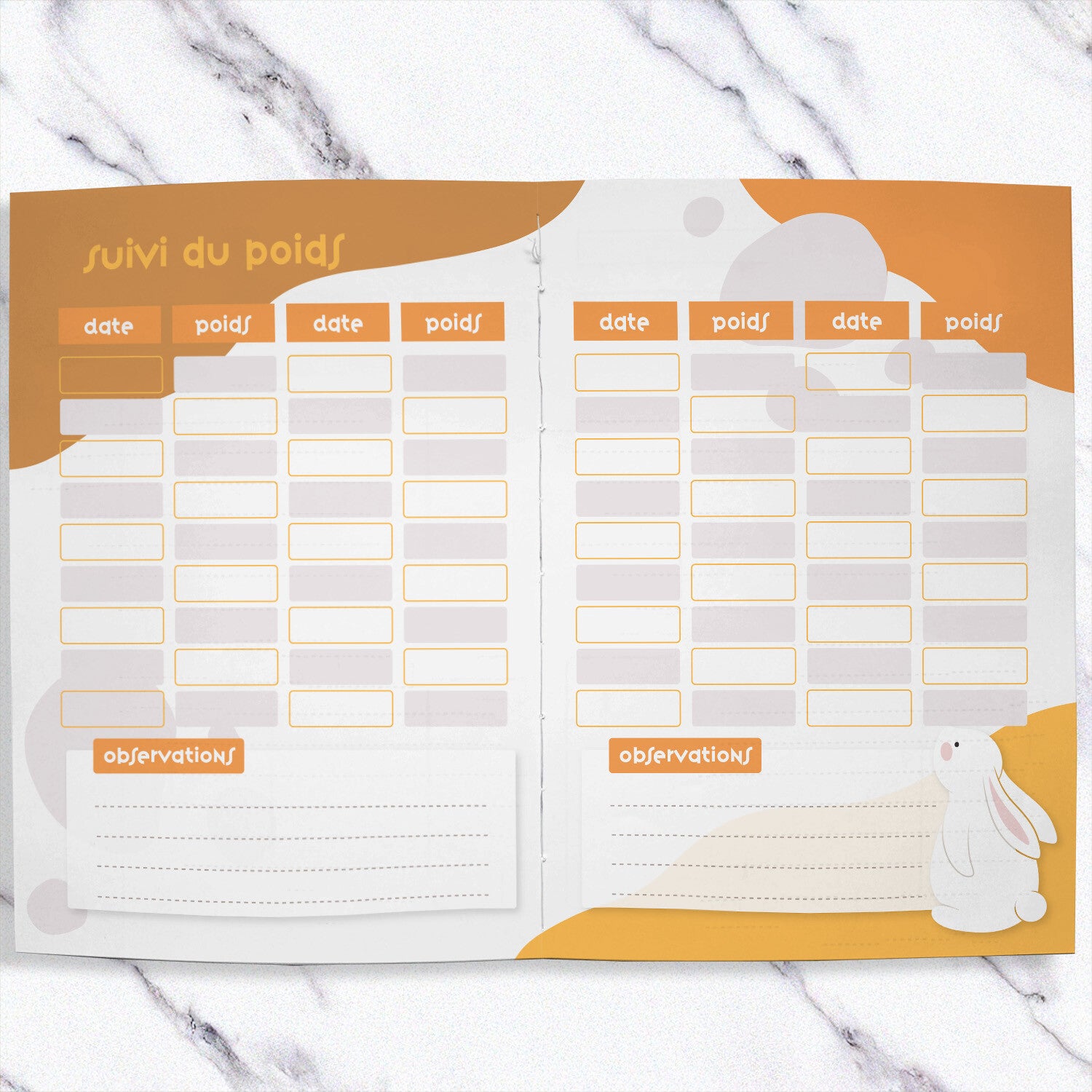 Ce carnet est entièrement conçu pour le suivi santé lapin, avec chaque détail qui compte : prise de poids, comportements, soins… et souvenirs de son quotidien !