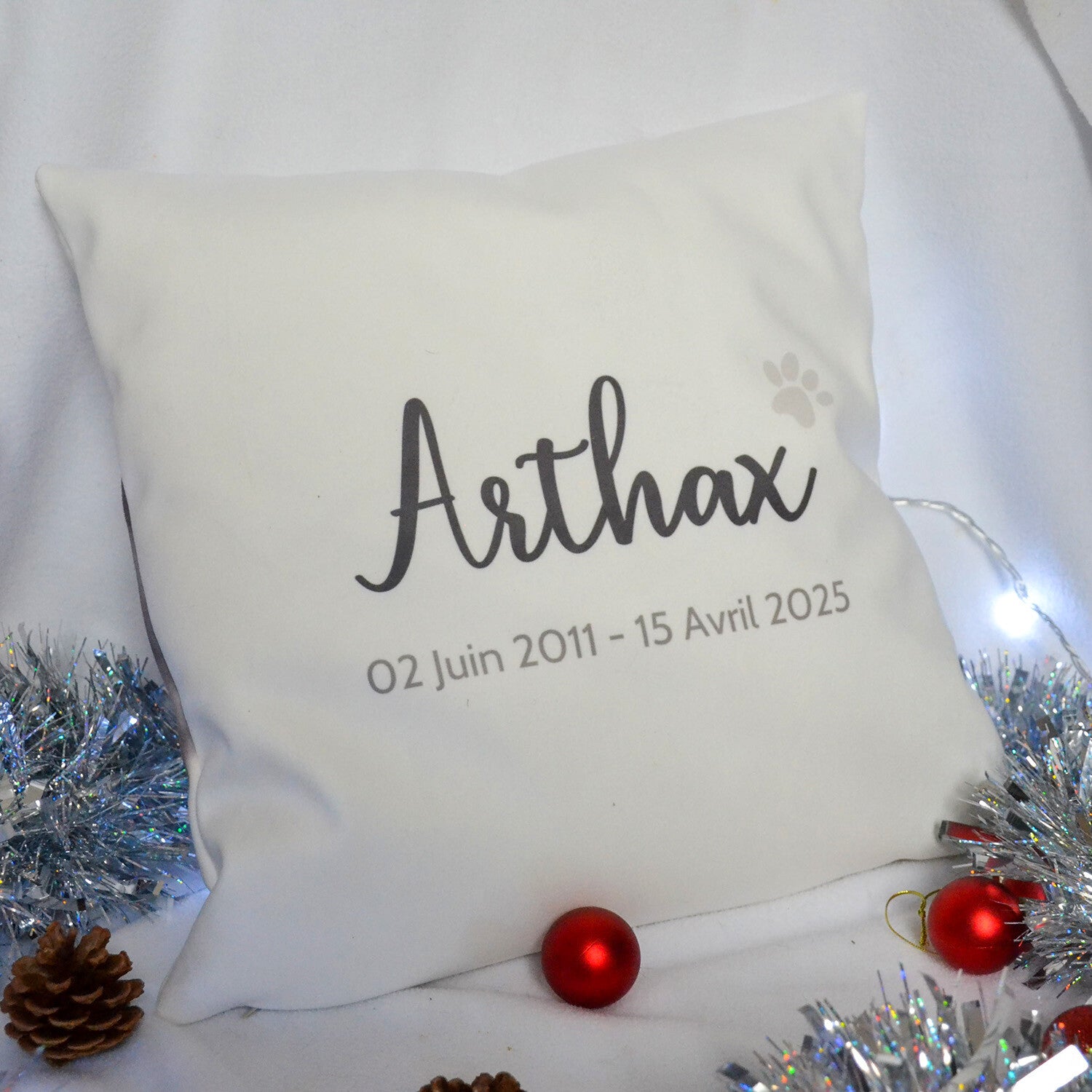 - Dos du coussin : personnalisable avec le prénom de ton animal, accompagné d’un petit mot, d’une date, ou d’une phrase de ton choix