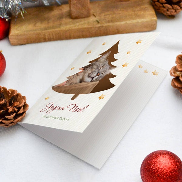 Cette carte de vœux personnalisée met ton animal à l’honneur grâce à sa photo insérée dans une forme de sapin, entouré d’étoiles dorées pour une ambiance festive et douce.